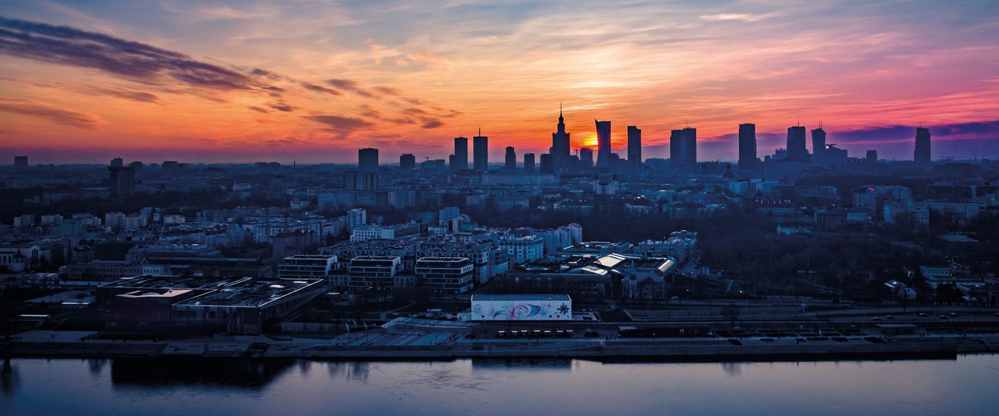 Die moderne Skyline von Warschau wird von dem ikonischen Kultur- und Wissenschaftspalast dominiert, einem der höchsten Gebäude Polens, das eine Aussichtsplattform bietet, von der aus Besucher einen herrlichen Blick auf die Stadt genießen können.