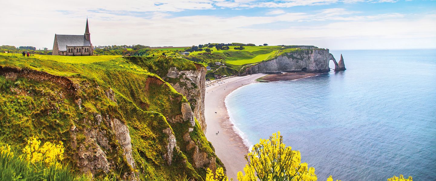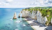 Ihre erste Etappe führt Sie zu einem der beeindruckendsten Naturwunder der Normandie, den majestätischen Kreideklippen von Etretat. Diese berühmten Felsformationen, die die Küste prägen, sind nicht nur ein visuelles Spektakel, sondern auch ein Ort voller Geschichten. Bewundern Sie die drei markanten Felsentore – die Porte d’Aval mit der Aiguille, die Manne Porte und die Porte d'Amont – während Sie entlang der kleinen Straßen der Alabasterküste radeln. Ihr nächstes Ziel ist Fécamp, einst der Hauptstützpunkt der französischen Neufundlandfischer, die von hier aus in die weiten Ozeane aufbrachen. Die Tour endet im charmanten Seebad Saint-Aubin-sur-Mer, wo die bunten Badehäuser einladend auf Sie warten. Übernachtung im Raum Rouen.